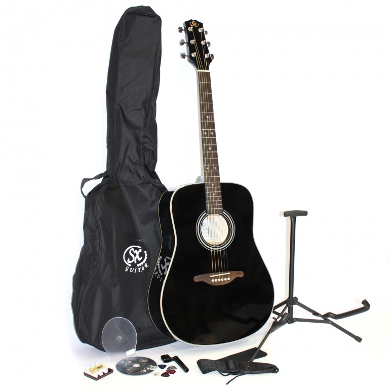 by SXPaket Akustična Gitara SX DG1K,crna sa belim bindingom i livenim čivijama.Ovaj instrument je u srednjoj višoj klasi(smreka prednja ploča...) i ima dobar i pun zvuk.Vrat je jako udoban a paket ima sve elemente kao na slici.
