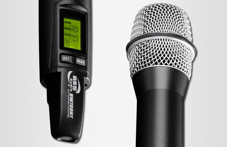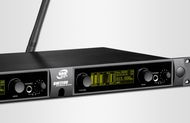 by Bes AudioBW720R / Dual-channel UHF Receiver 256x64 pixels Organic LED display with enhanced drop down menu. Two rotary encoders for each individual receiving channel. Every transmitter has a build-in 6-levels battery indicator accurately display battery life. Build-in equalizer with adjustable HPF, BPF, LPF. With cutting-age PC control interface. Transmitter will automatically SYNC &Locked with receiver for an unused frequency. Monitor headphone output connector with gain control. BW700HT / Handheld Transmitter Modulized microphone head design, user can easily change a new microphone head. LCD screen with light-green backlight indicates address code, bank no, Channel no.,Battery life, RF power, AF Gain, SYNC & Locked status. Adjustable RF power 10mW/30mW/50mW for different environment. Adjustable receiving gain control circuit for use in different environment. Wireless synchronization of transmitters via infrared interface. Ergonomic metal handheld body with embedded switches preventing unexpected Wrong operation.