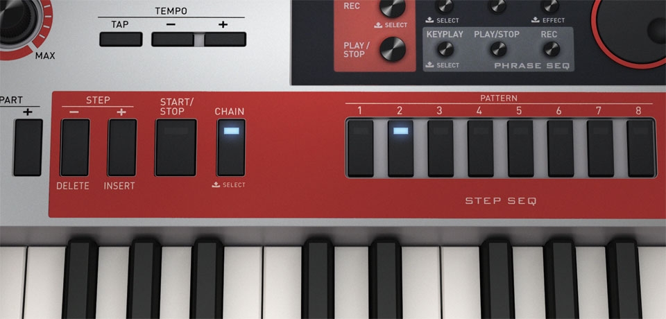 Step Sequencer lets users create and play back a variety of rhythm patterns • 100 different rhythm patterns are available for playback in the preset sequences • Up to 100 original rhythm patterns can be recorded as user sequences • Users can improvise using the set of 16 buttons while playing back rhythm patterns • Multiple rhythm patterns – as many as 99 – can be connected in a sequence and played