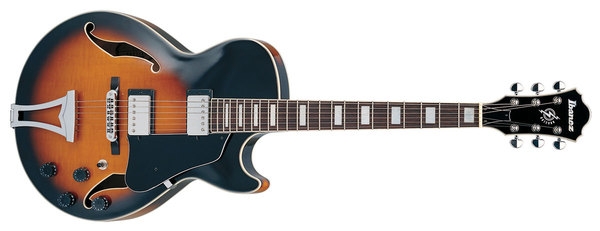 by IbanezThe AG has a slightly smaller body width than the more traditional AF dimensions. However, the same depth and true full-hollow body construction make for a big standout sound.