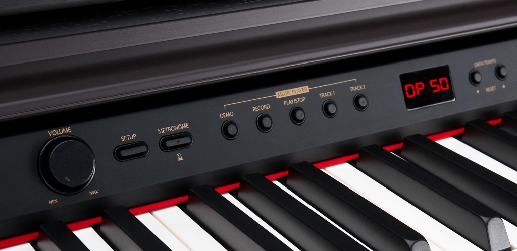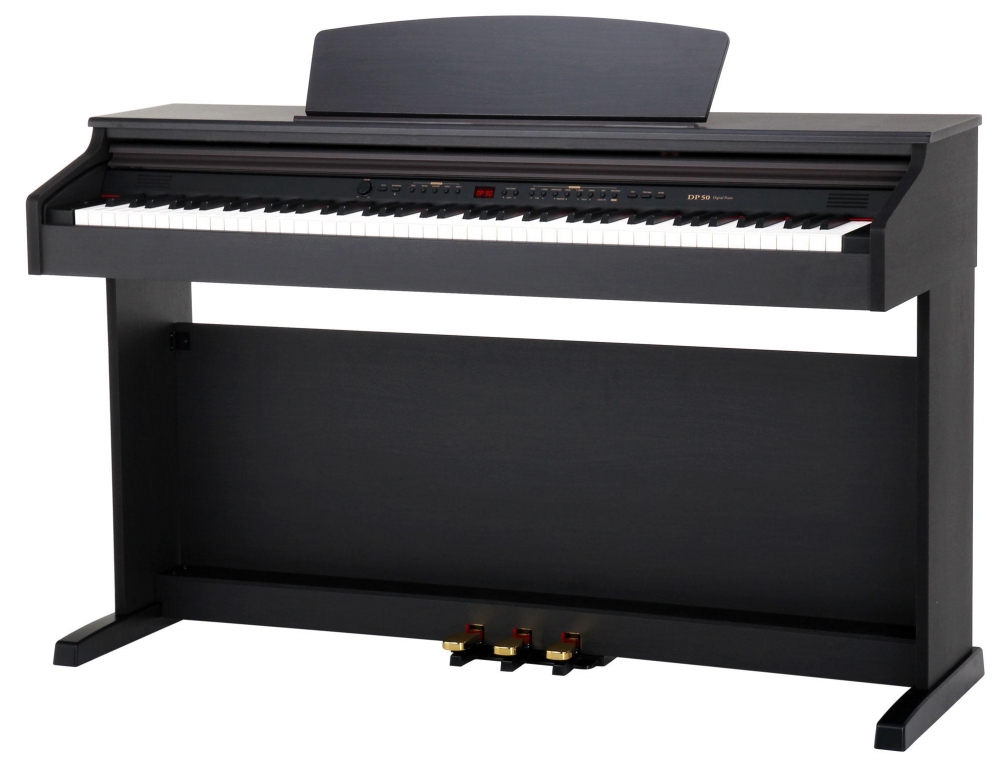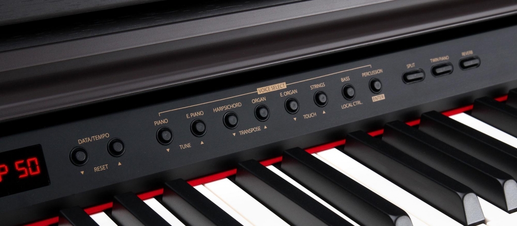 by Rock Corner-88 keys with hammer action, weighted keyboard with touch response, max. 32-note polyphony, 14 Voices, metronome