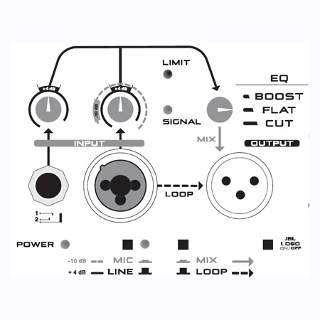 by JBLEON510, 254 mm (10 in) Differential Drive® woofer, 25.4 mm (1 in) neodymium high frequency compression driver coupled to a 100° H by 60° V waveguide. Both components are driven by the discrete channels of a 280 watt Class-D integrated power amplifier. The input section contains all cross-over functions, protection, and mixer functionality.