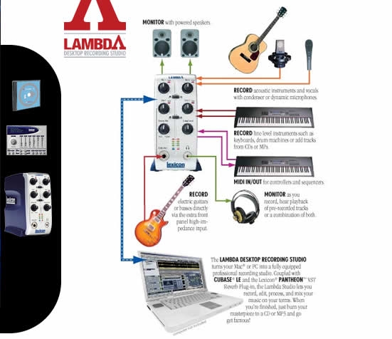 by LexiconProfesionalni USB interfejs za produkciju zvuka. Priljučite na vaš računar i uživajte u 24-bitnim snimcima. Lambda vam omogućava snimanje 2 kanala istovremeno. Možete priključiti i 2 kondenzatorska mikrofona pošto ima i fantom 48v napajanje. Na zadnjoj strani se nalaze i MIDI piključci kao i USB priključak.Ovaj uredjaj se može povezati i direktno na monitoring. Softverska kontrola vam daje i gomilu raznih efekata.
