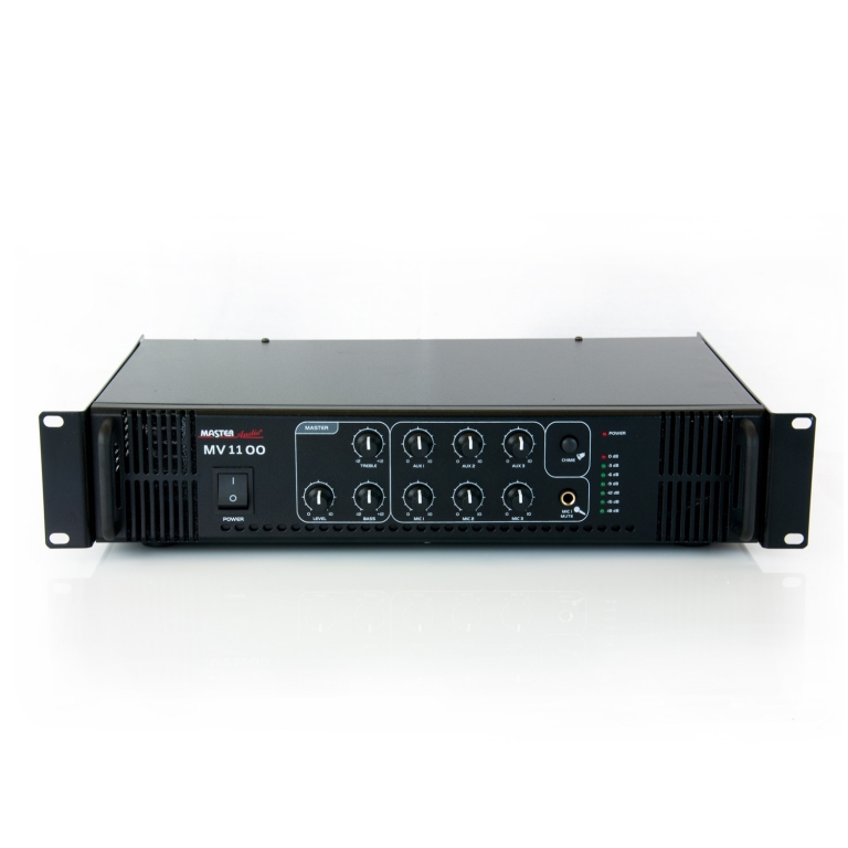 by Master AudioMaster Audio MV-1100 pojačalo ugradno koje je namenjeno za kancelarije, ustanove, magacine,prodavnice. Ovo pojačalo ima snagu 60W, na primer moze se postaviti do 20 plafonskih zvučnika po 3W i kontrolisati preko atenuatora. Ima ulaze za 3 mikrofona i 3 aux uredjaja kao i paging sistem koji može najaviti u objektu uključenje mikrofona.