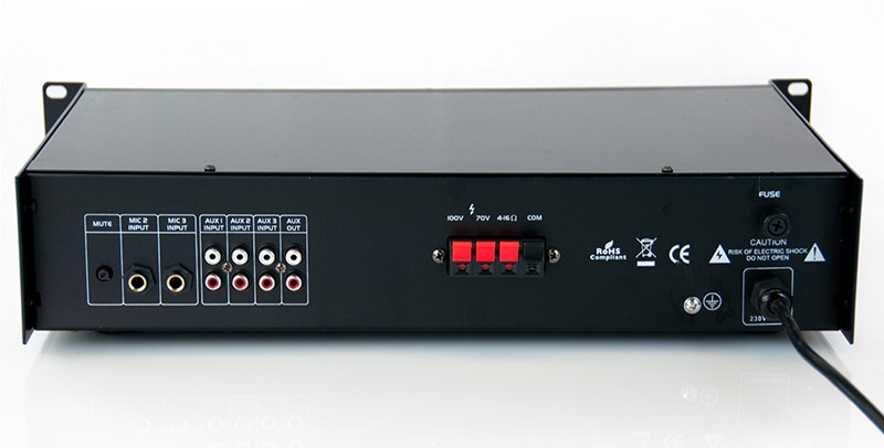 - Višenamesnko instalaciono pojačalo koje istovremeno može pokreteti zvučnike sistema 70/100 V i klasične zvučnike od 4 do 16 Ohm