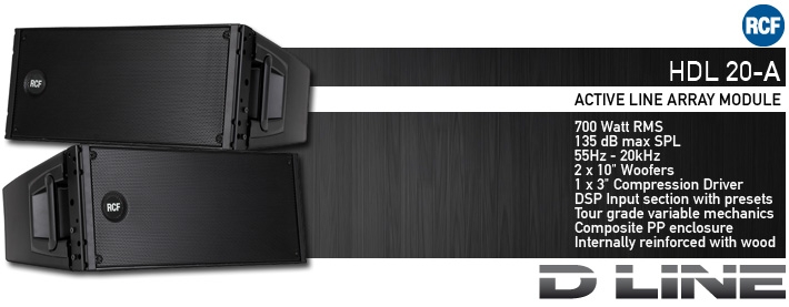 by RcfOvaj moćni zvučnik je snage 700w sa osetljivošću SPL na 135 dB, aktivan, BI amp, sa odličnim karakteristikama i namenjen je za Line Array sisteme iz serije RCF HDL koji se koriste kao binska ili koncertna ozvučenja za široke namene. Moze se upariti i sklopiti sistem po želji kao i snaga po želji i vrste namene. Sistem je beskonačno proširiv.